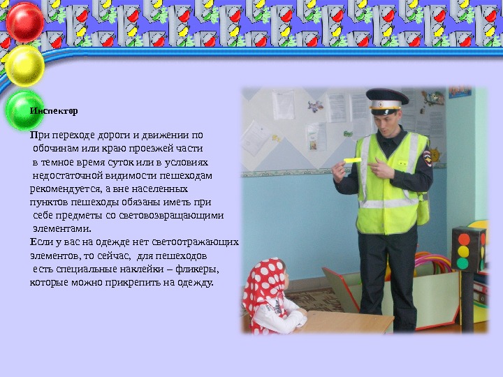Инспектор Ребята, в этом году 3 июля 2016 года исполняется 80 лет Инспекции дорожного движения МВД России. Знания правил дорожного движения необходимы всем. Умелое применение их в жизни поможет избежать сложных ситуаций на дороге, сохранить своё здоровье! А вы, ребята, что знаете о правилах дорожного движения? Ребята, а вы знаете, какие бывают знаки? Вот, например… (задает вопросы и показывает знаки детям: пешеходный переход, велосипедная дорожка, осторожно дети, стоянка, пункт медицинской помощи, въезд запрещен, подземный переход) Ребята , с 1 июля 2015 года вступили в силу очередные изменения правил дорожного движения регламентирующие обязательное наличие светоотражающих элементов у пешеходов вне населенных пунктов. При движении по обочинам или краю проезжей части в темное время суток или в условиях недостаточной видимости пешеходам рекомендуется иметь при себе предметы со светоотражающими элементами.