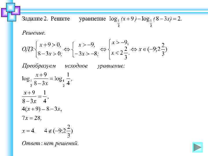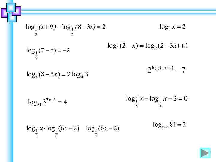 Цели урока: 1) образовательная: обобщение знаний по теме «Решение логарифмических уравнений» ; 2) воспитательная: воспитание умения работать в минигруппах, вместе; 3) развивающая: развитие самостоятельности, дифференцированного подхода к заданиям, умения принимать решения при выборе заданий.