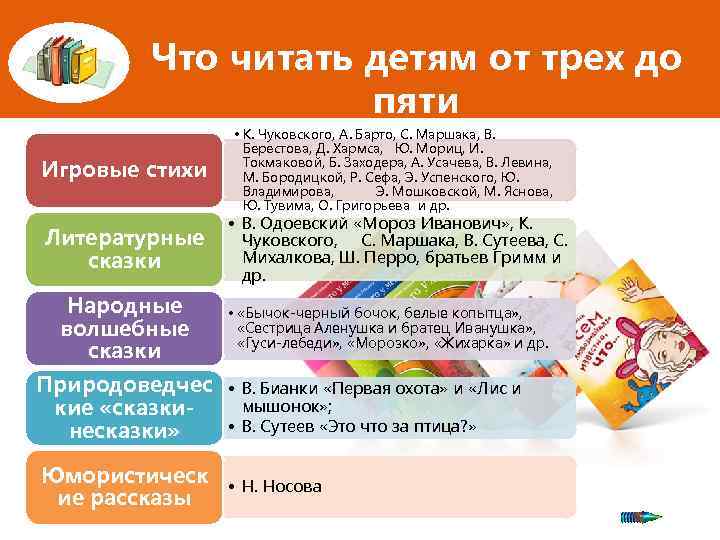 Что читать детям от трех до пяти Игровые стихи Литературные сказки Народные волшебные сказки • К. Чуковского, А. Барто, С. Маршака, В. Берестова, Д. Хармса, Ю. Мориц, И. Токмаковой, Б. Заходера, А. Усачева, В. Левина, М. Бородицкой, Р. Сефа, Э. Успенского, Ю. Владимирова, Э. Мошковской, М. Яснова, Ю. Тувима, О. Григорьева и др. • В. Одоевский «Мороз Иванович» , К. Чуковского, С. Маршака, В. Сутеева, С. Михалкова, Ш. Перро, братьев Гримм и др. • «Бычок-черный бочок, белые копытца» , «Сестрица Аленушка и братец Иванушка» , «Гуси-лебеди» , «Морозко» , «Жихарка» и др. Природоведчес кие «сказкинесказки» • В. Бианки «Первая охота» и «Лис и мышонок» ; • В. Сутеев «Это что за птица? » Юмористическ ие рассказы • Н. Носова