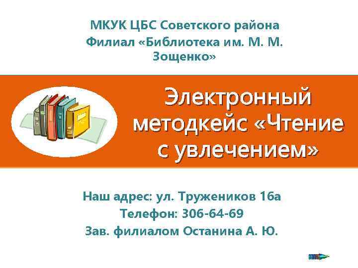 МКУК ЦБС Советского района Филиал «Библиотека им. М. М. Зощенко» Электронный методкейс «Чтение с увлечением» Наш адрес: ул. Тружеников 16 а Телефон: 306 -64 -69 Зав. филиалом Останина А. Ю.