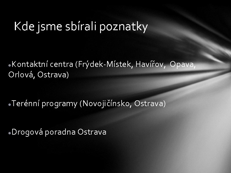 Kde jsme sbírali poznatky Kontaktní centra (Frýdek-Místek, Havířov, Opava, Orlová, Ostrava) Terénní programy (Novojičínsko, Ostrava) Drogová poradna Ostrava