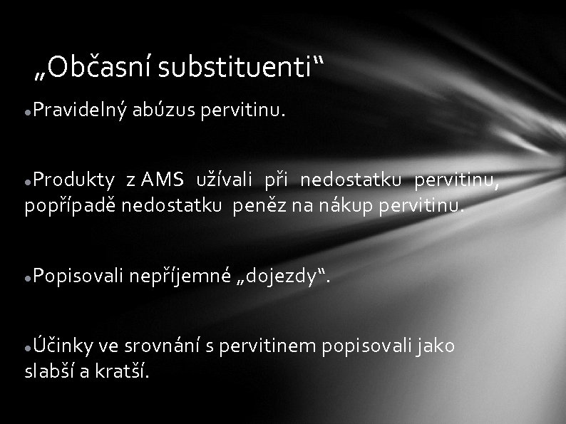 „Občasní substituenti“ Pravidelný abúzus pervitinu. Produkty z AMS užívali při nedostatku pervitinu, popřípadě nedostatku peněz na nákup pervitinu. Popisovali nepříjemné „dojezdy“. Účinky ve srovnání s pervitinem popisovali jako slabší a kratší.