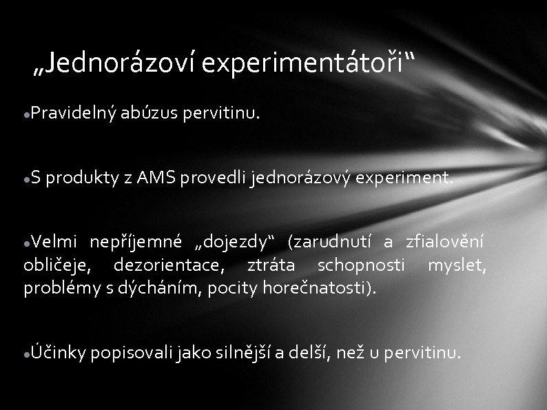 „Jednorázoví experimentátoři“ Pravidelný abúzus pervitinu. S produkty z AMS provedli jednorázový experiment. Velmi nepříjemné „dojezdy“ (zarudnutí a zfialovění obličeje, dezorientace, ztráta schopnosti myslet, problémy s dýcháním, pocity horečnatosti). Účinky popisovali jako silnější a delší, než u pervitinu.