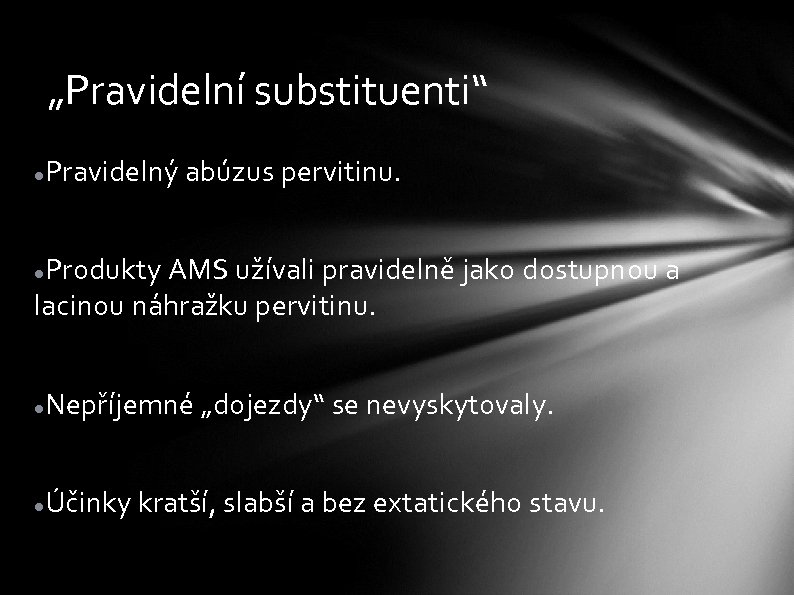 „Pravidelní substituenti“ Pravidelný abúzus pervitinu. Produkty AMS užívali pravidelně jako dostupnou a lacinou náhražku pervitinu. Nepříjemné „dojezdy“ se nevyskytovaly. Účinky kratší, slabší a bez extatického stavu.