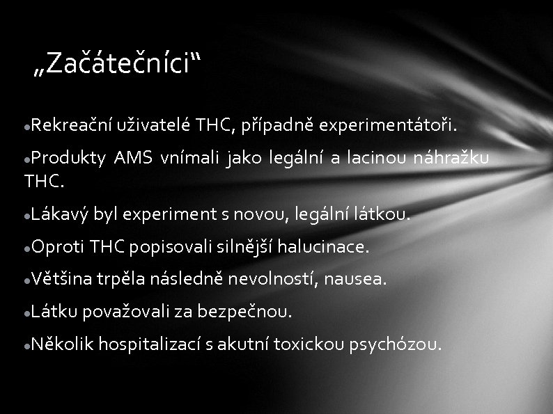 „Začátečníci“ Rekreační uživatelé THC, případně experimentátoři. Produkty AMS vnímali jako legální a lacinou náhražku THC. Lákavý byl experiment s novou, legální látkou. Oproti THC popisovali silnější halucinace. Většina trpěla následně nevolností, nausea. Látku považovali za bezpečnou. Několik hospitalizací s akutní toxickou psychózou.