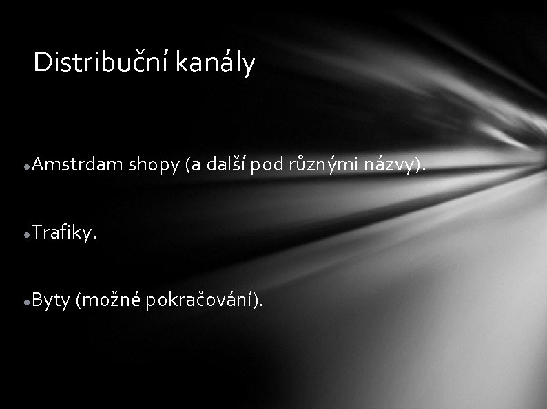 Distribuční kanály Amstrdam shopy (a další pod různými názvy). Trafiky. Byty (možné pokračování).