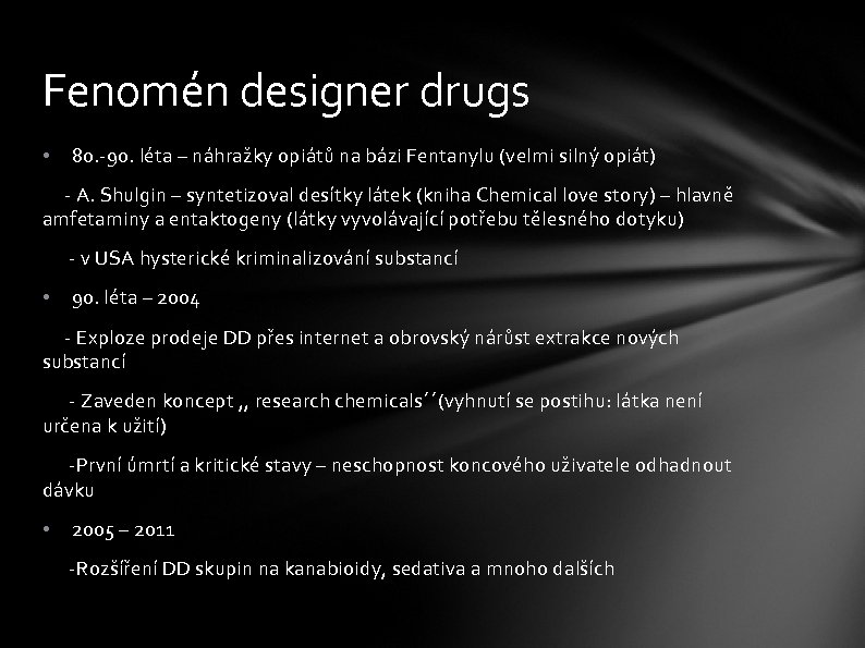 Fenomén designer drugs • 80. -90. léta – náhražky opiátů na bázi Fentanylu (velmi silný opiát) - A. Shulgin – syntetizoval desítky látek (kniha Chemical love story) – hlavně amfetaminy a entaktogeny (látky vyvolávající potřebu tělesného dotyku) - v USA hysterické kriminalizování substancí • 90. léta – 2004 - Exploze prodeje DD přes internet a obrovský nárůst extrakce nových substancí - Zaveden koncept , , research chemicals´´(vyhnutí se postihu: látka není určena k užití) -První úmrtí a kritické stavy – neschopnost koncového uživatele odhadnout dávku • 2005 – 2011 -Rozšíření DD skupin na kanabioidy, sedativa a mnoho dalších