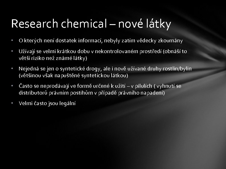 Research chemical – nové látky • O kterých není dostatek informací, nebyly zatím vědecky zkoumány • Užívají se velmi krátkou dobu v nekontrolovaném prostředí (obnáší to větší riziko než známé látky) • Nejedná se jen o syntetické drogy, ale i nově užívané druhy rostlin/bylin (většinou však napuštěné syntetickou látkou) • Často se neprodávají ve formě určené k užití – v pilulích ( vyhnutí se distributorů právním postihům v případě právního napadení) • Velmi často jsou legální