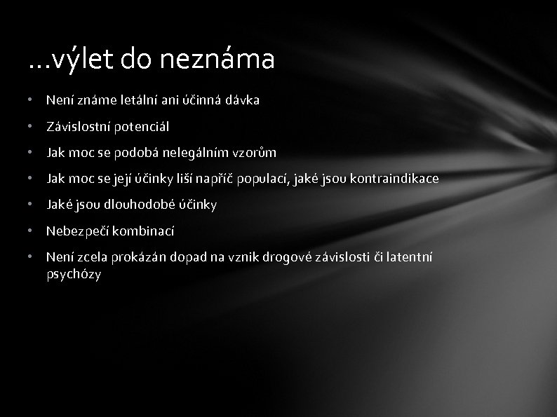 …výlet do neznáma • Není známe letální ani účinná dávka • Závislostní potenciál • Jak moc se podobá nelegálním vzorům • Jak moc se její účinky liší napříč populací, jaké jsou kontraindikace • Jaké jsou dlouhodobé účinky • Nebezpečí kombinací • Není zcela prokázán dopad na vznik drogové závislosti či latentní psychózy