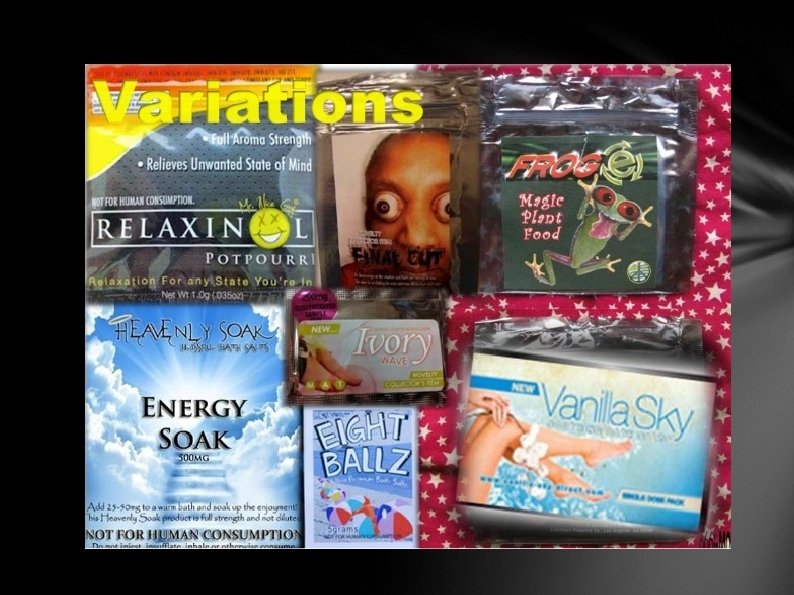 Syntetické kanabinoidy • Např. JWH-250, JWH-xxx – obsahují je i spice, produkty jako K 2, Euphoria • Doba účinku kratší při menších dávkách (0, 5 -1, 5 hod), až několik hodin při vyšších dávkách • Euforie, lepší nálada, smích X úzkost, neklid • Silnější účinky v porovnání s marihuanou (syntetický kanabinoid se na , , marihuanové receptory v mozku´´ váže rychleji), riziko , , přehulení´´ • Mírné začáteční povzbuzení (podobné , , nájezdům´´ halucinogenů) • Mohou se vyskytovat – zrakové halucinace, (př. Intezivnější barvy) • Intenzita rauše – halucinogenní efekt (podobný účinkům marihuany v jídle) • Fyzické účinky (např. tlukot srdce) mohou převyšovat ty psychické • Účinky mohou končit únavou až tvrdým spánkem • Rizika – zvýšená anxiozita (nepříjemný emoční stav, strach), tachykardie, horší bad tripy