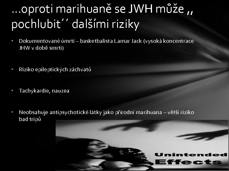 …oproti marihuaně se JWH může , , pochlubit´´ dalšími riziky • Dokumentované úmrtí – basketbalista Lamar Jack (vysoká koncentrace JHW v době smrti) • Riziko epileptických záchvatů • Tachykardie, nauzea • Neobsahuje antipsychotické látky jako přírodní marihuana – větší riziko bad tripů