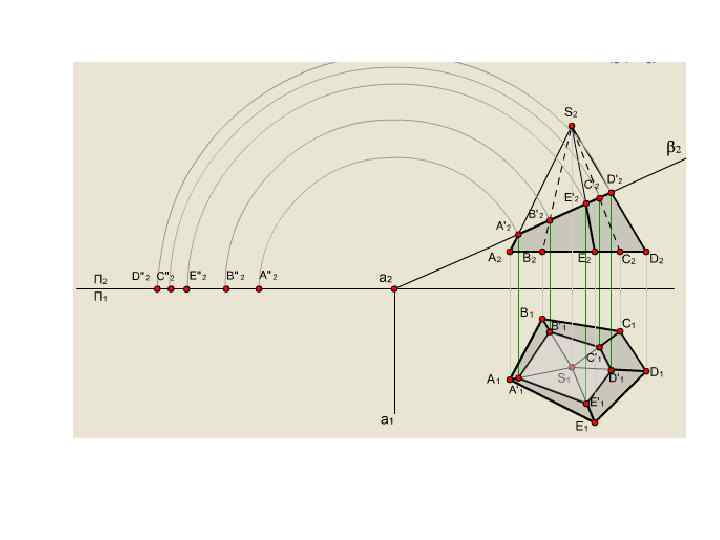 1. Отмечаем точки А'2, B'2, E'2, C'2, D'2 — точки пересечения плоскости β с ребрами пирамиды.