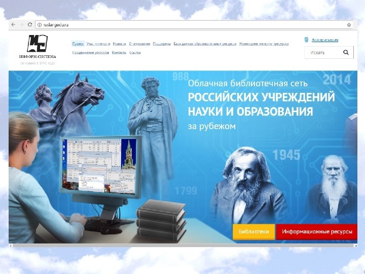«Активизация информационной политики по продвижению ресурсов русского языка и образования на русском языке на основе создания облачных сетей и объединенных электронных ресурсов российских учреждений науки и образования за рубежом» ФЦП «Русский язык» на 2016 – 2020 годы В рамках этого проекта на базе АБИС "МАРК Cloud" уже в 2016 -2017 г. создаются облачные библиотечные сети и объединенные электронные ресурсы следующих организаций: • российских центров науки и культуры за рубежом; • русских центров и кабинетов русского языка фонда "Русский мир"; • русских школ за рубежом; • межгосударственных славянских университетов за рубежом; • Федерального государственного бюджетного образовательного учреждения высшего образования "Государственный институт русского языка им. А. С. Пушкина"; • Ханойского филиала Института русского языка им. А. С. Пушкина; • Центра изучения русского языка и образования на русском языке Института Пушкина на базе культурно-образовательного российского центра в Париже Сайт проекта: ruslangedu. ru
