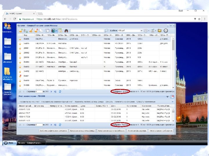 Создание пилотной облачной сети библиотек общеобразовательных учреждений города Москвы Проект Департамента образования города Москвы «Создание пилотной сети 100 школьных библиотек города Москвы на базе облачных информационных технологий» Срок реализации проекта: 2016 г. В результате реализации проекта: • автоматизированы 273 школьные библиотеки, ранее не имевшие средств автоматизации • интегрированы в облачную сеть 380948 каталожных записей и записей о фонде • перенесены в облачную сеть БД и электронные ресурсы из 7 различных АБИС Сайт поддержки проекта: help. moslib. net