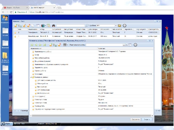 Основные типовые функциональные возможности • Каталогизация. • Поддержка форматов семейства MARC (схемы данных в составе типовой конфигурации). • Учет фонда (в соответствии с нормативными документами по учету литературы). • Информационный поиск (в том числе, с учетом морфологии). • Систематизация (ведение справочников, классификаторов, тезаурусов; индексирование и рубрицирование информационных ресурсов). • Электронная библиотека (с управлением правами на электронный контент, защищенным режимом его представления и полнотекстовым поиском). • Поддержка информационного обслуживания (прием и выполнение читательских заказов). • Поддержка процессов на пункте книговыдачи и книгохранилище. • Импорт и экспорт каталожных данных в форматах MARC (RUSMARC, MARC 21 в бинарном и XML-представлении и разных кодировках). • Учет пользователей. • Учет книгообеспеченности учебного процесса. • Сервисы личного кабинета. • Самозапись читателя. • Журналирование операций с каталогами, справочниками и всех процессов.