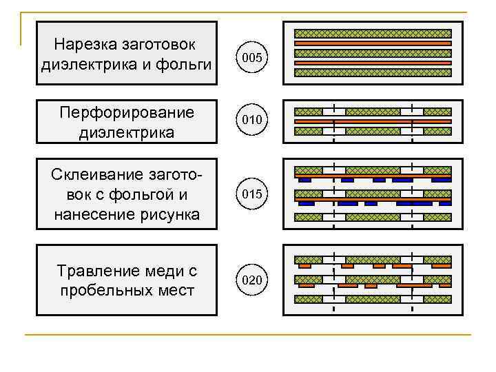 Нарезка заготовок диэлектрика и фольги 005 Перфорирование диэлектрика 010 Склеивание заготовок с фольгой и нанесение рисунка 015 Травление меди с пробельных мест 020