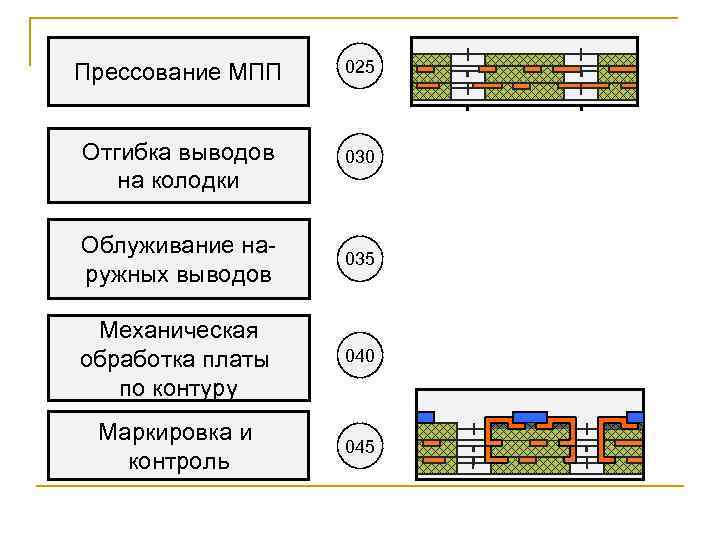 Прессование МПП 025 Отгибка выводов на колодки 030 Облуживание наружных выводов 035 Механическая обработка платы по контуру 040 Маркировка и контроль 045
