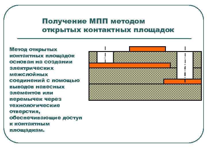 Получение МПП методом открытых контактных площадок Метод открытых контактных площадок основан на создании электрических межслойных соединений с помощью выводов навесных элементов или перемычек через технологические отверстия, обеспечивающие доступ к контактным площадкам.