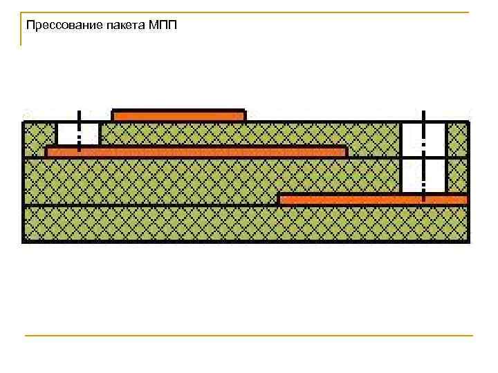 Получение МПП методом металлизации сквозных отверстий Метод металлизации сквозных отверстий характеризуется тем, что собирают пакет из отдельных слоев фольгированного диэлектрика (внешних слоев из одностороннего, внутренних – из двустороннего) и межслойных склеивающихся прокладок. Пакет прессуют, а межслойные соединения выполняют путем химикогальванической металлизации сквозных отверстий.