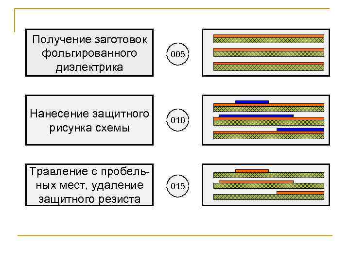 Получение заготовок фольгированного диэлектрика 005 Нанесение защитного рисунка схемы 010 Травление с пробельных мест, удаление защитного резиста 015