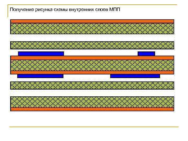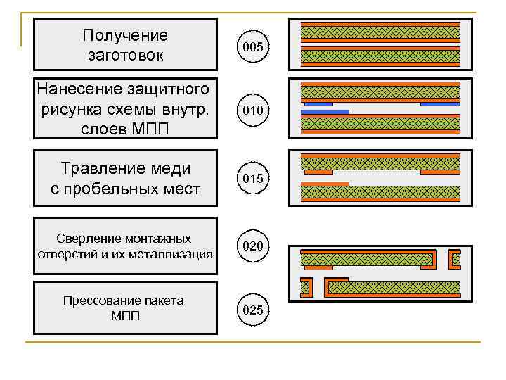 Получение заготовок 005 Нанесение защитного рисунка схемы внутр. слоев МПП 010 Травление меди с пробельных мест 015 Сверление монтажных отверстий и их металлизация 020 Прессование пакета МПП 025
