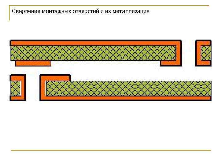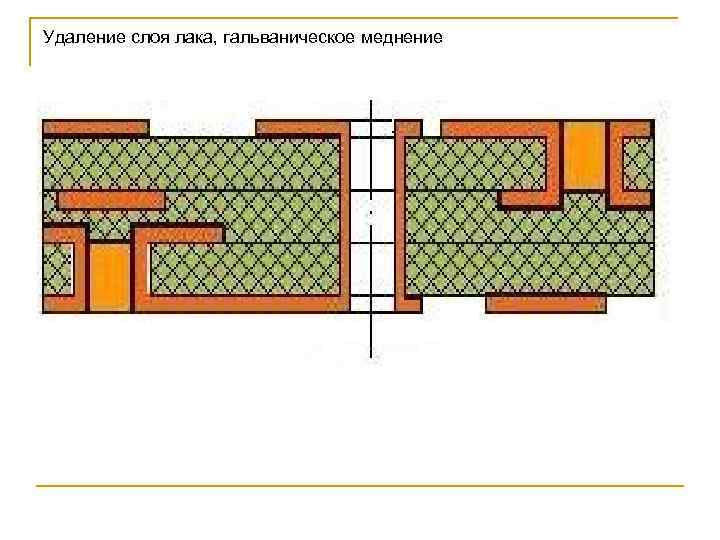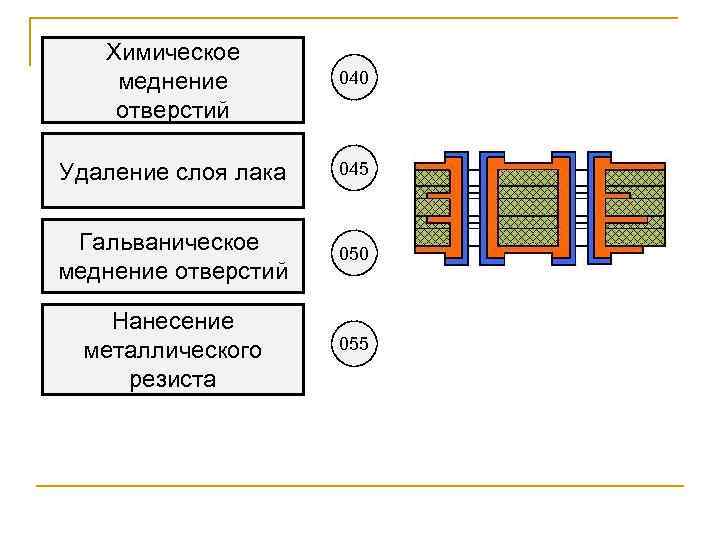 Химическое меднение отверстий 040 Удаление слоя лака 045 Гальваническое меднение отверстий 050 Нанесение металлического резиста 055