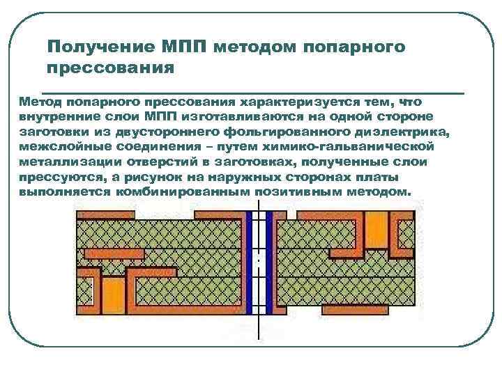 Получение МПП методом попарного прессования Метод попарного прессования характеризуется тем, что внутренние слои МПП изготавливаются на одной стороне заготовки из двустороннего фольгированного диэлектрика, межслойные соединения – путем химико-гальванической металлизации отверстий в заготовках, полученные слои прессуются, а рисунок на наружных сторонах платы выполняется комбинированным позитивным методом.