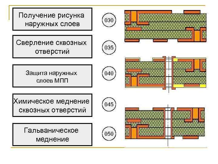 Получение рисунка наружных слоев 030 Сверление сквозных отверстий 035 Защита наружных слоев МПП 040 Химическое меднение сквозных отверстий 045 Гальваническое меднение 050