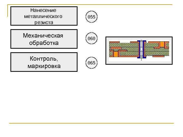 Нанесение металлического резиста 055 Механическая обработка 060 Контроль, маркировка 065
