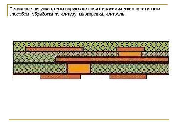 Получение рисунка схемы наружного слоя фотохимическим негативным способом, обработка по контуру, маркировка, контроль.
