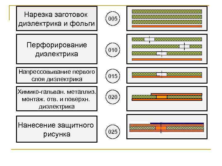 Нарезка заготовок диэлектрика и фольги 005 Перфорирование диэлектрика 010 Напрессовывание первого слоя диэлектрика 015 Химико-гальван. металлиз. монтаж. отв. и поверхн. диэлектрика 020 Нанесение защитного рисунка 025