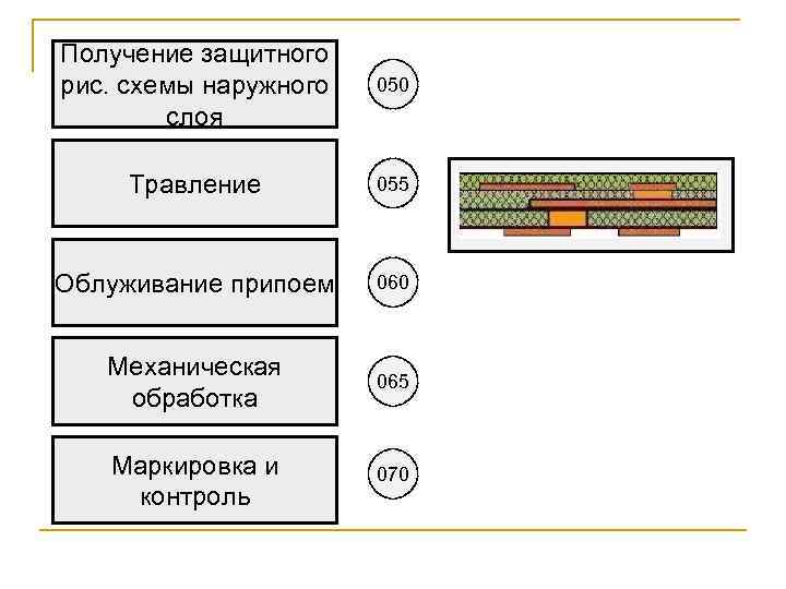 Получение защитного рис. схемы наружного слоя 050 Травление 055 Облуживание припоем 060 Механическая обработка 065 Маркировка и контроль 070
