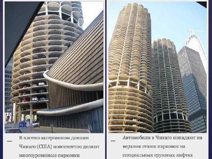 Виды парковок • капитальные одноуровневые кирпичные или металлические гаражи • отдельно стоящие многоуровневые парковки и гаражные боксы • подземные гаражи и парковки