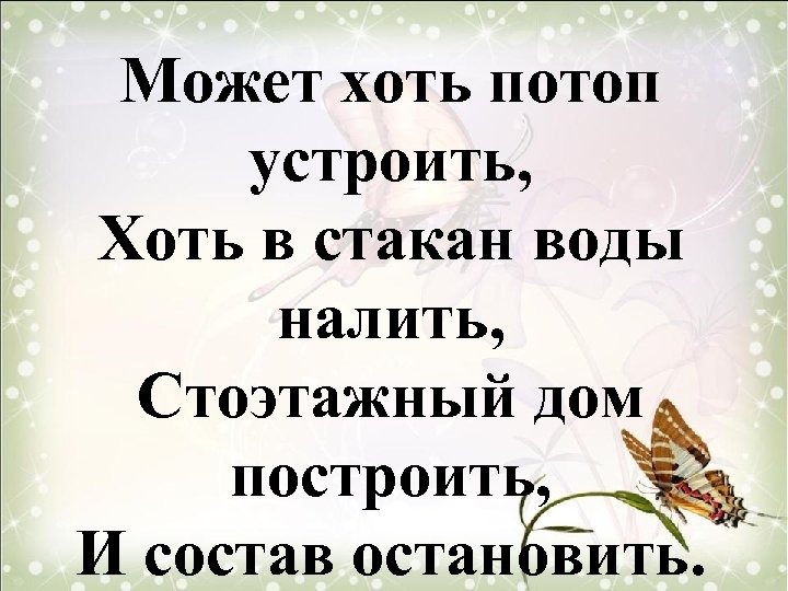 Может хоть потоп устроить, Хоть в стакан воды налить, Стоэтажный дом построить, И состав остановить.