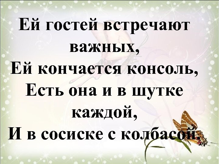 Ей гостей встречают важных, Ей кончается консоль, Есть она и в шутке каждой, И в сосиске с колбасой.
