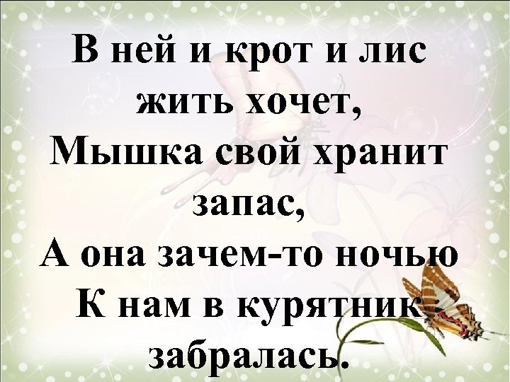 В ней и крот и лис жить хочет, Мышка свой хранит запас, А она зачем-то ночью К нам в курятник забралась.
