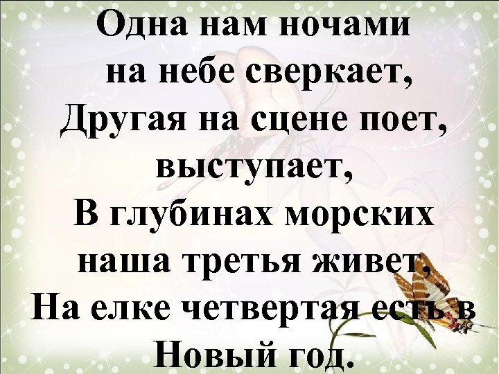 Одна нам ночами на небе сверкает, Другая на сцене поет, выступает, В глубинах морских наша третья живет, На елке четвертая есть в Новый год.