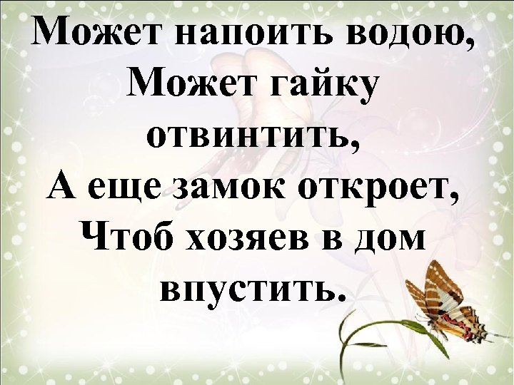 Может напоить водою, Может гайку отвинтить, А еще замок откроет, Чтоб хозяев в дом впустить.