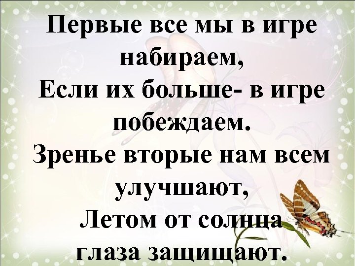 Первые все мы в игре набираем, Если их больше- в игре побеждаем. Зренье вторые нам всем улучшают, Летом от солнца глаза защищают.