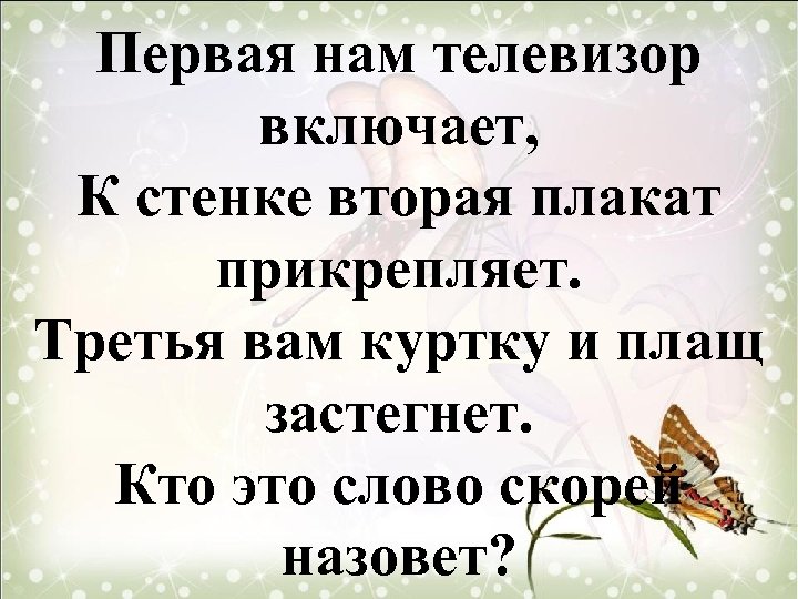 Первая нам телевизор включает, К стенке вторая плакат прикрепляет. Третья вам куртку и плащ застегнет. Кто это слово скорей назовет?