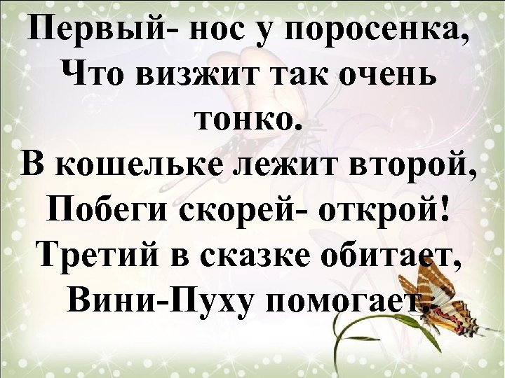Первый- нос у поросенка, Что визжит так очень тонко. В кошельке лежит второй, Побеги скорей- открой! Третий в сказке обитает, Вини-Пуху помогает.
