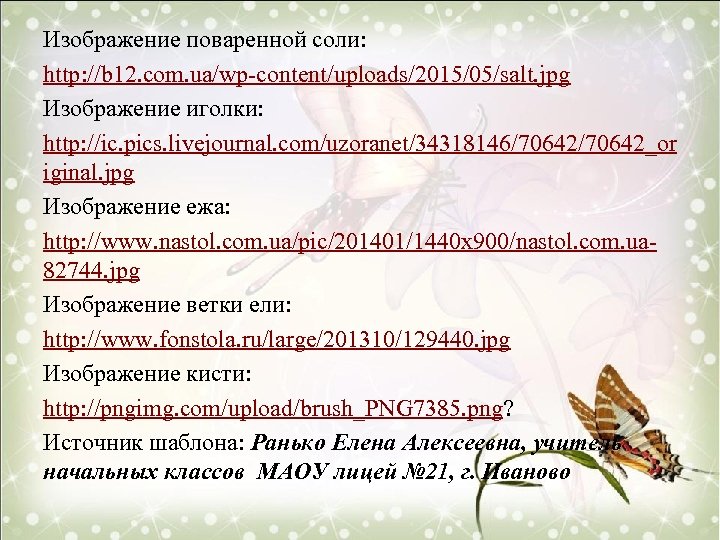 Изображение поваренной соли: http: //b 12. com. ua/wp-content/uploads/2015/05/salt. jpg Изображение иголки: http: //ic. pics. livejournal. com/uzoranet/34318146/70642_or iginal. jpg Изображение ежа: http: //www. nastol. com. ua/pic/201401/1440 x 900/nastol. com. ua 82744. jpg Изображение ветки ели: http: //www. fonstola. ru/large/201310/129440. jpg Изображение кисти: http: //pngimg. com/upload/brush_PNG 7385. png? Источник шаблона: Ранько Елена Алексеевна, учитель начальных классов МАОУ лицей № 21, г. Иваново
