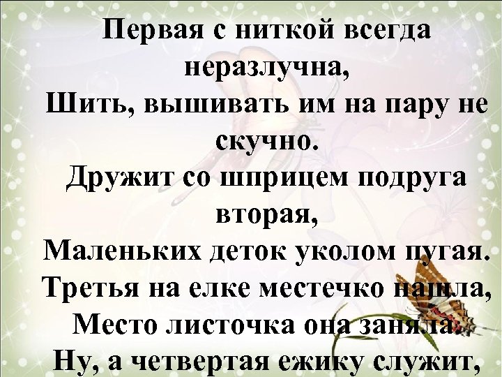 Первая с ниткой всегда неразлучна, Шить, вышивать им на пару не скучно. Дружит со шприцем подруга вторая, Маленьких деток уколом пугая. Третья на елке местечко нашла, Место листочка она заняла. Ну, а четвертая ежику служит,