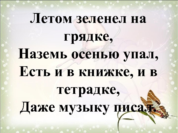Летом зеленел на грядке, Наземь осенью упал, Есть и в книжке, и в тетрадке, Даже музыку писал.