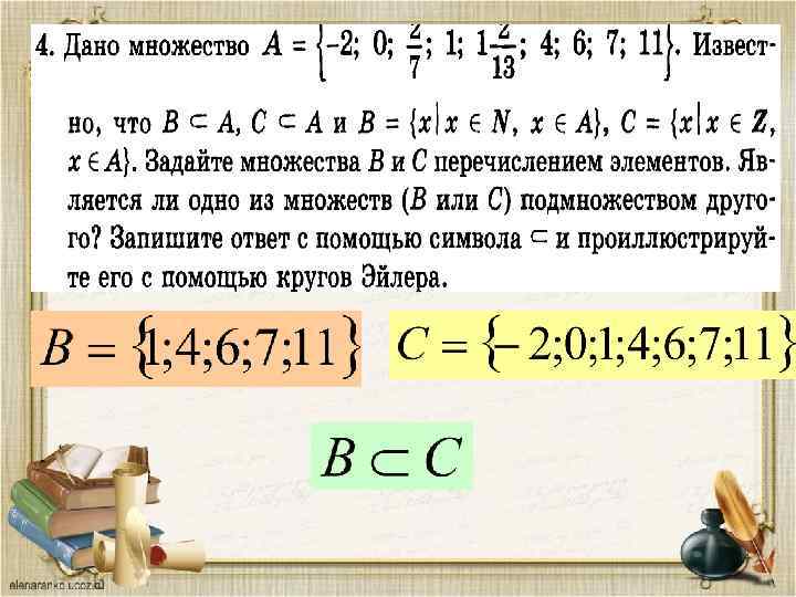 Теоретический опрос • Что такое множество? Подмножество? • Как обозначают множества? • Какое множество всегда является подмножеством любого другого? • Какие бывают множества? • Какие способы задания множества Вы изучили? • Какие числовые множества изучаются в 5 -6 классе? • Что такое круги Эйлера?