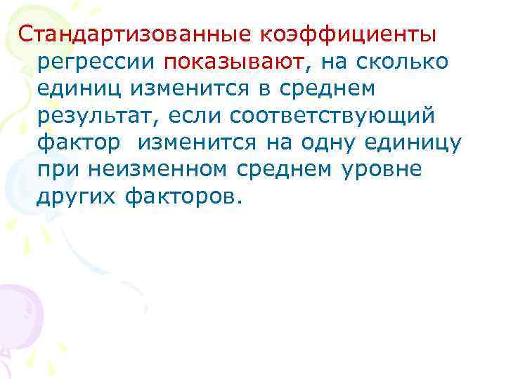 Стандартизованные коэффициенты регрессии показывают, на сколько единиц изменится в среднем результат, если соответствующий фактор изменится на одну единицу при неизменном среднем уровне других факторов.