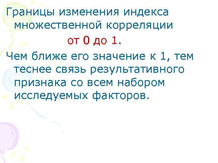 Границы изменения индекса множественной корреляции от 0 до 1. Чем ближе его значение к 1, тем теснее связь результативного признака со всем набором исследуемых факторов.