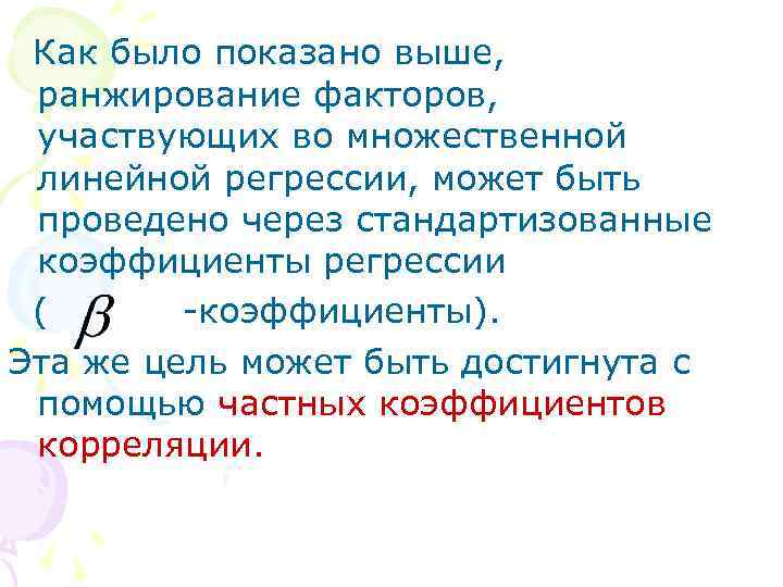 Как было показано выше, ранжирование факторов, участвующих во множественной линейной регрессии, может быть проведено через стандартизованные коэффициенты регрессии ( -коэффициенты). Эта же цель может быть достигнута с помощью частных коэффициентов корреляции.