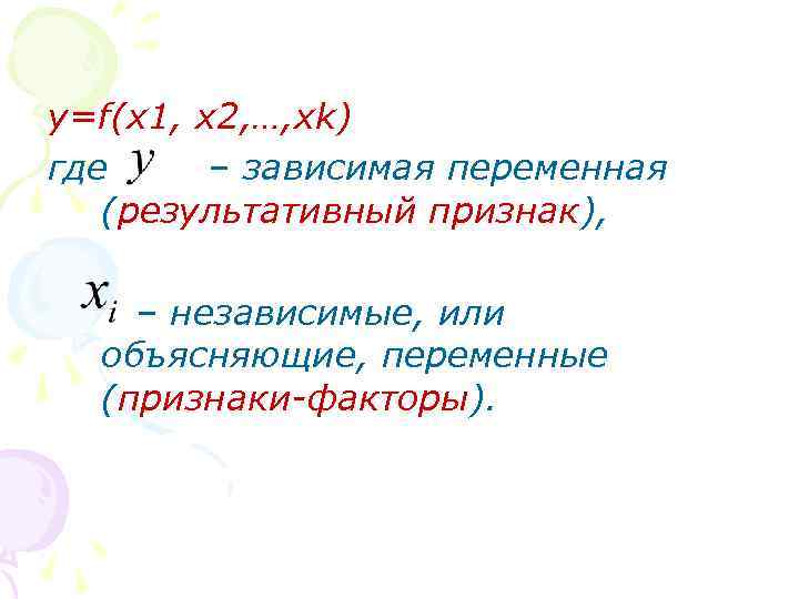 y=f(x 1, x 2, …, xk) где – зависимая переменная (результативный признак), – независимые, или объясняющие, переменные (признаки-факторы).