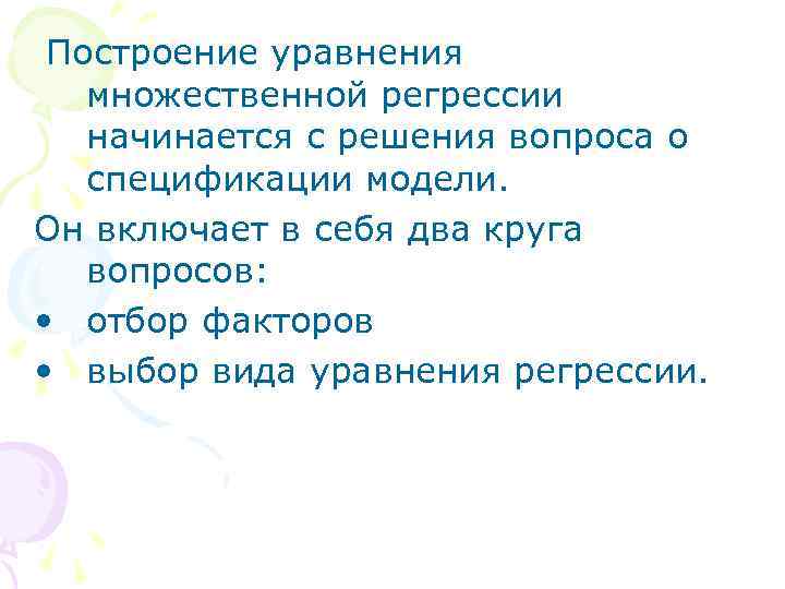 Построение уравнения множественной регрессии начинается с решения вопроса о спецификации модели. Он включает в себя два круга вопросов: • отбор факторов • выбор вида уравнения регрессии.